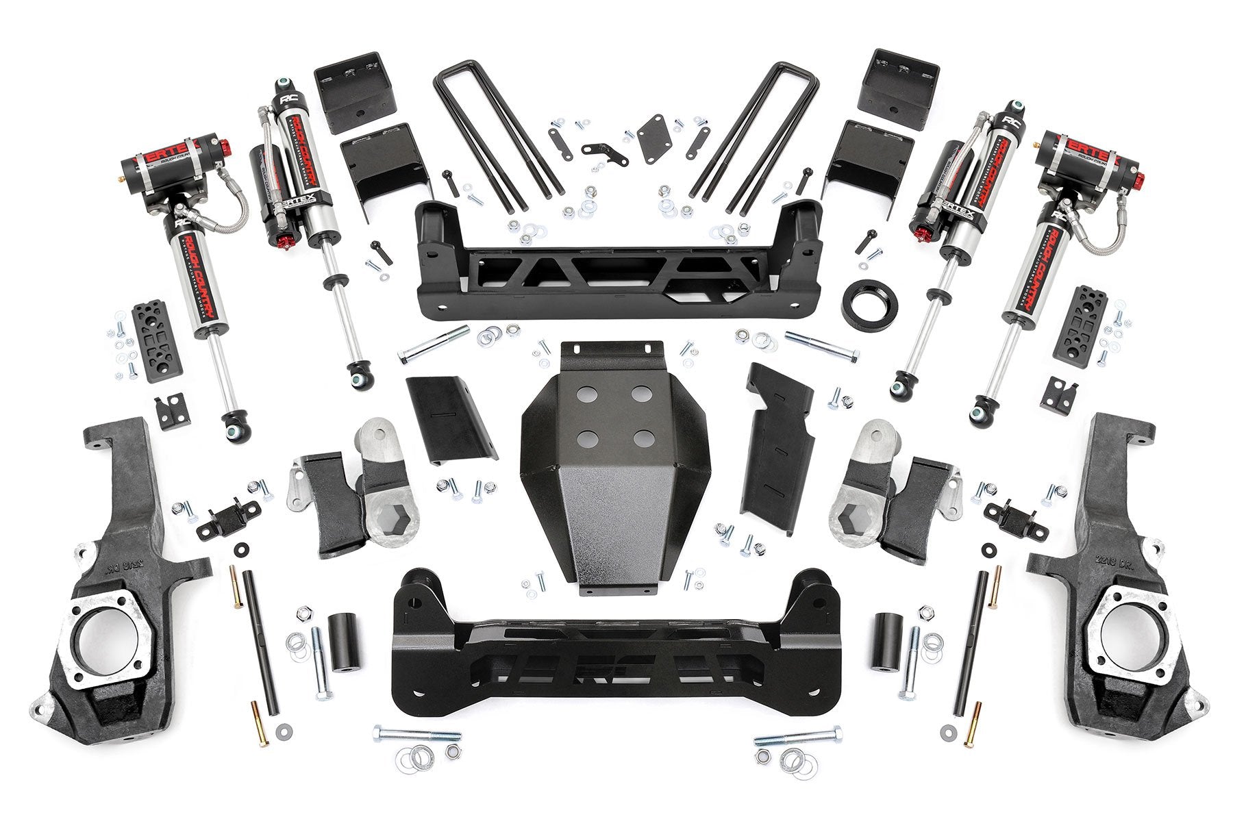 Right off the lot The GM 2500 HD has an impressive stance and a killer look, inspiring Rough Country to build a kit that would add crucial enhancements while taking nothing away from this sharp looking, new model truck. The 7.5" N3 Suspension Lift for GM 2500 HD features a Non-Torsion Drop Design for better clearance and handling while maintaining proper angles in a "clean and tucked away" fashion. This kit also features Heavy Duty components worthy of the HD badge; With 1/4" thick steel crossmembers, 1/2" thick NTD Brackets, and a durable, thick Skid Plate - all laser-cut and powder coated in our "Hammer Black" color to match the factory components. Installation requires no drilling or modifying the differential, meaning no "invasive" mods to your new toy. A set of braided Stainless Steel Brake Lines hones the whole package in. Our innovative HD lift doesn't just look like it came from the showroom floor, it drives like it did too. This kit doesn't widen the stock track width, and the Non Torsion Drop design keeps everything at optimum angles, leaving that factory feel to handling corners and turns. A full set of Nitrogen charged N2.0 Shock Absorbers offer 10-Stage velocity sensitive valving, and are custom valved for each model kit we offer - meaning you get a set of shocks designed to preserve your factory ride quality.