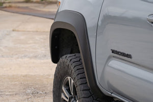 Style and Protection. Unlock the power of real protection and custom style with Rough Country's Sport Style Fender Flares for your Toyota Tacoma! Offering 5.75 inches of Flare Height, you know your truck is getting the coverage it needs from flying debris and road grime. Not only will these flares safeguard your vehicle, but they will look great too - featuring a bold custom look that stands out and turns heads. Plus, if you want to take your customization game up a notch, these fender flares are easily paintable so they can match your truck in color and style. Get ready to rock this new rugged look – with Rough Country's Tacoma Sport Style Fender Flares!