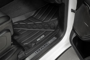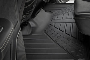 Introducing Flex-Fit floor mats ΓÇö the ultimate enhancement for your truck's interior and built tough to handle any challenge. Crafted from premium rubber-like material, these mats are as durable as they come, perfectly tailored to fit your truck's unique shape for a seamless finish.\Stock floor mats just don't cut it for adventurers. They get trashed by mud, don't hold up to spills, and leave your carpets a mess. Give your ride the all-weather protection it deserves with Rough Country's Flex-Fit Floor Mats, the perfect solution for keeping your vehicle clean and protected.\All-Weather Protection: Engineered to fit your vehicle perfectly, these mats provide top-notch defense against snow, mud, sand, saltwater, and more.\Spill Saver Lip: Don't sweat the spills! Our mats feature a Spill Saver Lip that prevents liquids from reaching your carpet, so you can enjoy your coffee on the go without worry.\Non-Slip, Textured Surface: Stay in control no matter the terrain with our mats' non-slip, textured surface, designed to keep your feet firmly planted while driving.\Easy to Clean and Maintain: Cleaning up is a breeze! These mats are detachable and easy to clean, so you can spend less time on maintenance and more time hitting the road.\Premium Materials: Constructed from a rubber-like TPE material, these mats are built to withstand extreme temperatures without cracking or warping. They will stay flexible and functional for the long haul.\Effortless Installation: Forget wrestling with bulky mats. Flex-Fit Mats slide right into place for a quick and frustration-free installation.\Upgrade your truck's defense against the elements with Rough Country's Flex-Fit Floor Mats. They'll keep your carpets looking fresh and give you peace of mind on every adventure.