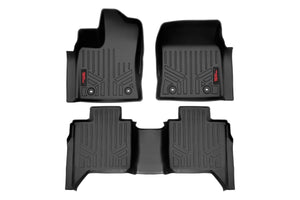 Keep your carpet in pristine condition with Rough Country's Floor Armor: Heavy Duty Floor Mats and Rear Cargo Liners. These eco-friendly, semi-flexible floor mats are made of an ultra-durable Polyethylene that offers a strong, rigid shape that's incredibly easy to clean.\Where simple rubber floor mats fail, Rough Country's line of Floor Armor is guaranteed for life and will never crack, split, or break-down over time. The high-quality design extends the lifespan of your carpets and the raised-lip design ensures your interior will always be protected from mud, moisture, and more.\These contoured floor mats are laser-measured for each make and model; designed to be a precise fit that grips the carpet and stays put. An aggressive looking textured surface gives your muddy shoes plenty of traction and looks great inside the vehicle.\No matter what you track in, Rough Country Floor Armor is incredibly easy to clean. Just pop them out of the floorboards and rinse away the dirt! Includes Rough Country's Lifetime Replacement Warranty.