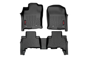 Keep your carpet in pristine condition with Rough Country's Floor Armor: Heavy Duty Floor Mats and Rear Cargo Liners. These eco-friendly, semi-flexible floor mats are made of an ultra-durable Polyethylene that offers a strong, rigid shape that's incredibly easy to clean.\Where simple rubber floor mats fail, Rough Country's line of Floor Armor is guaranteed for life and will never crack, split, or break-down over time. The high-quality design extends the lifespan of your carpets and the raised-lip design ensures your interior will always be protected from mud, moisture, and more.\These contoured floor mats are laser-measured for each make and model; designed to be a precise fit that grips the carpet and stays put. An aggressive looking textured surface gives your muddy shoes plenty of traction and looks great inside the vehicle.\No matter what you track in, Rough Country Floor Armor is incredibly easy to clean. Just pop them out of the floorboards and rinse away the dirt! Includes Rough Country's Lifetime Replacement Warranty.