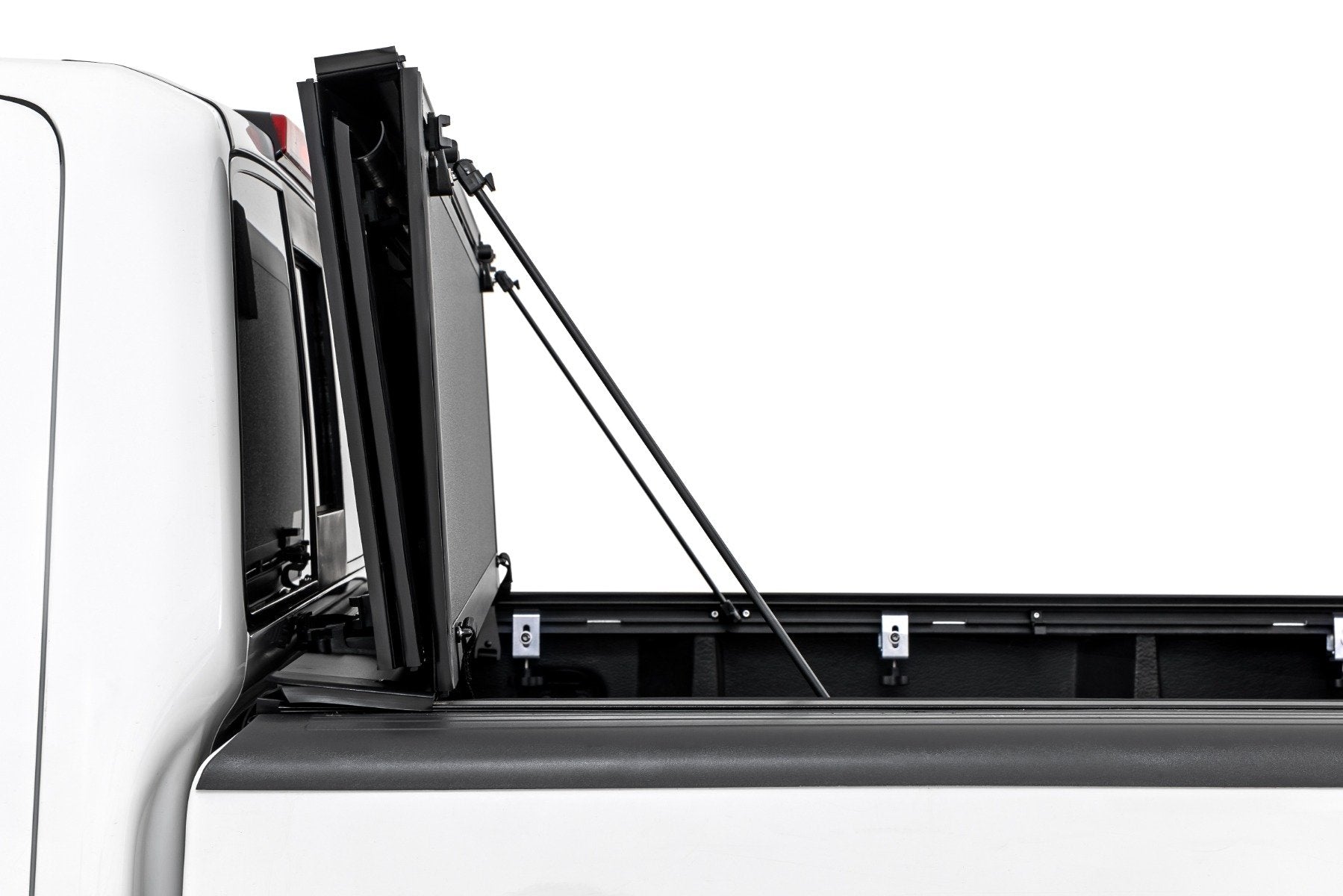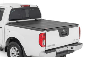 Elevate your Nissan's functionality and appearance with Rough Country's second-generation Frontier Hard Tri-fold Flip-up Bed Cover. Unlike traditional bed covers that limit access to your truck bed, our innovative Flip-up design grants you complete access to your truck bed, making it easier to load and unload large items.\Full-Bed Access: With Rough Country's Tri-fold Flip-up Bed Cover, you can conveniently flip up the cover, allowing full-bed access without the hassle of removing the cover.\Built to Last: Our bed cover is crafted from lightweight aluminum and boasts a resilient powder coat finish. This coating resists corrosion and wear, ensuring that your truck bed maintains its pristine appearance even in harsh weather conditions.\Superior Water Drainage System: The bed rails of this bed cover feature an innovative water drainage system. No need to worry about water pooling on your cover or seeping into your truck bed.\Premium Weather Seals: The Tri-fold cover also includes top-of-the-line weather-resistant seals that create a tight and secure barrier along the bed rails. These seals ensure your cargo remains protected from the elements, even in inclement weather.\Secure Cargo Storage: Provide added security for your truck bed contents, deterring theft and protecting valuable items.\Elevate your Frontier's bed and get full access, unmatched durability, and superior weather protection with Rough Country's Hard Tri-fold Flip-up Bed Cover!