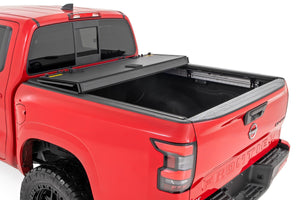 Elevate your Nissan's functionality and appearance with Rough Country's third-generation Frontier Hard Tri-fold Flip-up Bed Cover. Unlike traditional bed covers that limit access to your truck bed, our innovative Flip-up design grants you complete access to your truck bed, making it easier to load and unload large items.\Full-Bed Access: With Rough Country's Tri-fold Flip-up Bed Cover, you can conveniently flip up the cover, allowing full-bed access without the hassle of removing the cover.\Built to Last: Our bed cover is crafted from lightweight aluminum and boasts a resilient powder coat finish. This coating resists corrosion and wear, ensuring that your truck bed maintains its pristine appearance even in harsh weather conditions.\Superior Water Drainage System: The bed rails of this bed cover feature an innovative water drainage system. No need to worry about water pooling on your cover or seeping into your truck bed.\Premium Weather Seals: The Tri-fold cover also includes top-of-the-line weather-resistant seals that create a tight and secure barrier along the bed rails. These seals ensure your cargo remains protected from the elements, even in inclement weather.\Secure Cargo Storage: Provide added security for your truck bed contents, deterring theft and protecting valuable items.\Elevate your Frontier's bed and get full access, unmatched durability, and superior weather protection with Rough Country's Hard Tri-fold Flip-up Bed Cover!