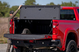 Elevate your GM's functionality and appearance with Rough Country's fourth-generation Chevy/GMC 1500 Hard Tri-fold Flip-up Bed Cover. Unlike traditional bed covers that limit access to your truck bed, our innovative Flip-up design grants you complete access to your truck bed, making it easier to load and unload large items. \Full-Bed Access: With Rough Country's Tri-fold Flip-up Bed Cover, you can conveniently flip up the cover, allowing full-bed access without the hassle of removing the cover.\Built to Last: Our bed cover is crafted from lightweight aluminum and boasts a resilient powder coat finish. This coating resists corrosion and wear, ensuring that your truck bed maintains its pristine appearance even in harsh weather conditions.\Superior Water Drainage System: The bed rails of this bed cover feature an innovative water drainage system. No need to worry about water pooling on your cover or seeping into your truck bed.\Premium Weather Seals: The Tri-fold cover also includes top-of-the-line weather-resistant seals that create a tight and secure barrier along the bed rails. These seals ensure your cargo remains protected from the elements, even in inclement weather.\Secure Cargo Storage: Provide added security for your truck bed contents, deterring theft and protecting valuable items.\Elevate your Ram’s truck bed and get full access, unmatched durability, and superior weather protection with Rough Country's Hard Tri-fold Flip-up Bed Cover!