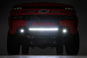 Who says you can't have a great-looking vehicle that also can conquer any task at hand. Here at Rough Country, we are providing jaw-dropping good looks and functionality with Rough Country's Hidden Winch Bumper.\Rough Country's Hidden Winch Bumper provides the best of both worlds offering a stylish new approach for equipping a recovery system to your vehicle. Featuring a standard 4.5in X 10in 4 bolt Winch Mount, our hidden winch bumper can fit most standard size winches up to 12,000 lbs and does NOT impede airflow to the radiator. Boasting a combined lumen output of 14,880 between the included 30" and two 2" led pods taking to the road less traveled is a worry of the past. \Best of all, Rough Country's hidden winch bumper offers a slim, sleek design that follows the factory features. Being constructed of durable steel construction and offering ease of installation this product is a must-have for your 19+ Chevy Silverado.
