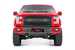Give the front-end of your Ford F-150 a unique look with Rough CountryΓÇÖs Mesh Grille kit! This easy to install grille replacement kit swaps out your stock grille with the eye-catching, head-turning good looks of this aftermarket upgrade. With a unique, laser-cut mesh pattern surrounded by stylish, stainless steel rivets, this grill gives your truck a more menacing look thatΓÇÖs sure to draw attention. This kit features a Rough Country's 30ΓÇ¥ Curved Dual-Row Black-Series LED light bar with Cree LED's outputting a staggering 14,400 Lumens and 180 Watts of lighting power. Includes a mountable on/off switch, wiring harness, and our 3 Year LED Warranty! This easy-to-install grille requires no cutting or drilling and can be returned to stock at any time. Each kit is powdercoated black to resist corrosion and give a long lifespan of good looks. This kit also allows you to retain your active grille shutter system and front camera and features Rough CountryΓÇÖs Lifetime Replacement Warranty!