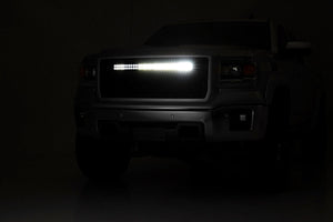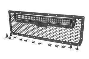 Give the front-end of your GMC 1500 a unique look with Rough CountryΓÇÖs Mesh Grille kit. This grille replacement kit swaps out your stock grille with the eye-catching, head-turning good looks of this aftermarket upgrade. With a unique, laser-cut mesh pattern surrounded by stylish, stainless steel rivets, this grill gives your truck a more menacing look thatΓÇÖs sure to draw attention. Each kit is powdercoated black to resist corrosion and give a long lifespan of good looks. This kit features a Rough Country's 30ΓÇ¥ Curved Dual-Row Black-Series LED light bar with Cree LED's outputting a staggering 14,400 Lumens and 180 Watts of lighting power. Includes a mountable on/off switch, wiring harness, and our 3 Year Warranty!