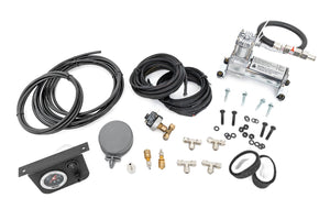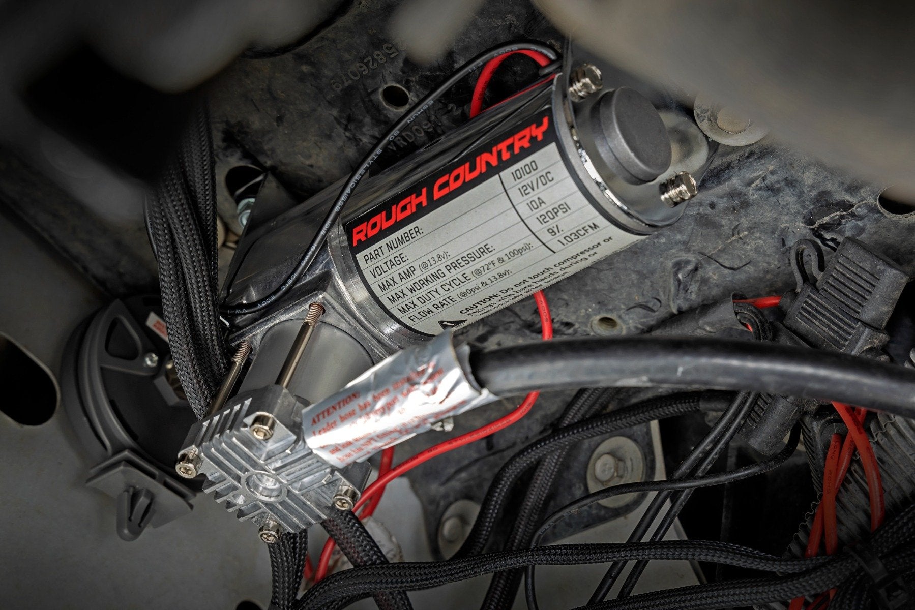 Air Up and Go with Rough Country. You never know when you're going to need a bit more air in your springs and with Rough Country's Air Bag Compressor Kit, you will have an instant source of air for inflation. Our kit allows you to adjust the air pressure in your air springs from the touch of a button, so you can easily adjust the load support and leveling capacity of your vehicle. And let's face it, the extra convenience is always a plus!\Heavy-Duty and Reliable. The Air Compressor Kit is moisture and dust-resistant, and it comes with a high-pressure leader hose. Our heavy-duty compressor has a recommended max working pressure of 120 PSI. In addition, it includes a gauge and all necessary wiring and air line to tie into your existing Rough Country Air Spring Kit. So, your vehicle's air springs can be adjusted at any time without having to look for an air source. And thanks to the low-pressure sensor, you can be sure that your air springs are always correctly inflated.\Installation. This easy-to-install kit includes all the hardware you need to get up and running, as well as wiring and air line to tie into your existing setup. Plus, it mounts easily to your vehicle's frame so that you can be on your way in no time.\Warranty. Rough Country's Onboard Air Compressor Kit is backed with a limited lifetime warranty towards manufacturer defects. With our industry-leading warranty, give yourself peace of mind when using Rough Country's products!