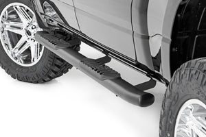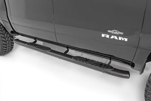 Gain easier access to your cab with the classic, OEM look of Rough CountryΓÇÖs Oval Nerf Step Bars. These durable, steel side steps feature a comfortable, 4.5-inch wide stepping area built into a large, tubular nerf rail that mimics the look of the popular OEM oval step design.\Each nerf board features a long-lasting black powder coat and durable steel construction that can support up to 500lbs! Each step offers a 30-degree angled end design looks great on any vehicle. A secure, 4.5-inch wide stepping area features a non-slip pad to ensure a confident footing each and every time.