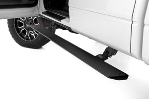 Step up in style. Sidesteps have come a long way, and now we've taken them to the next level with Rough Country's Power Running Boards! These retractable E-Boards tuck tight for a clean look when not in use and automatically extend when the door is opened. With an anti-slip surface that provides a secure stepping area, getting in and out of your ride has never been easier. Our Power Running Boards also include LED lights that provide illumination when deployed and shut off when steps are closed, providing a sleek, aerodynamic look.\ Premium Construction. The Rough Country E-Board Steps combine durability, strength, and style. These 6" all-season steps are made from lightweight yet durable aluminum and can support up to 660 lbs per side. Equipped with dual motor technology, these steps can handle anything Mother Nature throws their way. They feature an automatic 'SAFE-STOP' mechanism that engages if a blockage is detected and include an interior bypass switch for manual override. So whether you're heading out on a weekend errand or loading up for a camping trip, our electric steps offer reliable protection for all your adventures.\Installation. These easy-to-install steps are the perfect solution for getting in and out of your vehicle. No drilling is required for installation, and the steps tuck tight under the rocker panel when not in use. Don't struggle to get in and out of your vehicle anymore. Make life easier with Rough Country's Power Running Boards.\Warranty. Rough Country backs its products with a limited lifetime replacement warranty. Our products are protected from structural and workmanship damage after purchase. Our industry-leading warranty gives you peace of mind when using Rough Country products!