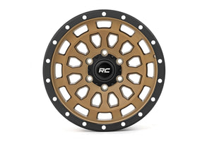 Stand-out Look. Rough Country 87 Series Bronze Wheels are built for maximum durability and strength with high-performance styling that ensures that it's ready to withstand anything on the street. Opting to upgrade your stock wheels will provide you with a rugged appearance and outstanding performance that you expect from Rough Country products. The 87 Series bronze Wheel is a must for anybody who wants to add a bold new look to make your ride stand out from the crowd.\Superior Design. Our Series 87 Bronze Wheels feature a high-quality bronze finish with matte black simulated bead lock and one-piece aluminum construction that delivers a strong, durable wheel. These copper color wheels boast an aggressive design and include a Rough Country black center cap, so you can tackle the road in style. Rough Country's Copper Wheels come with a 1-year finish and Limited Lifetime Structural Warranty.