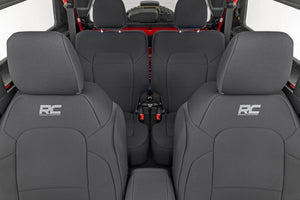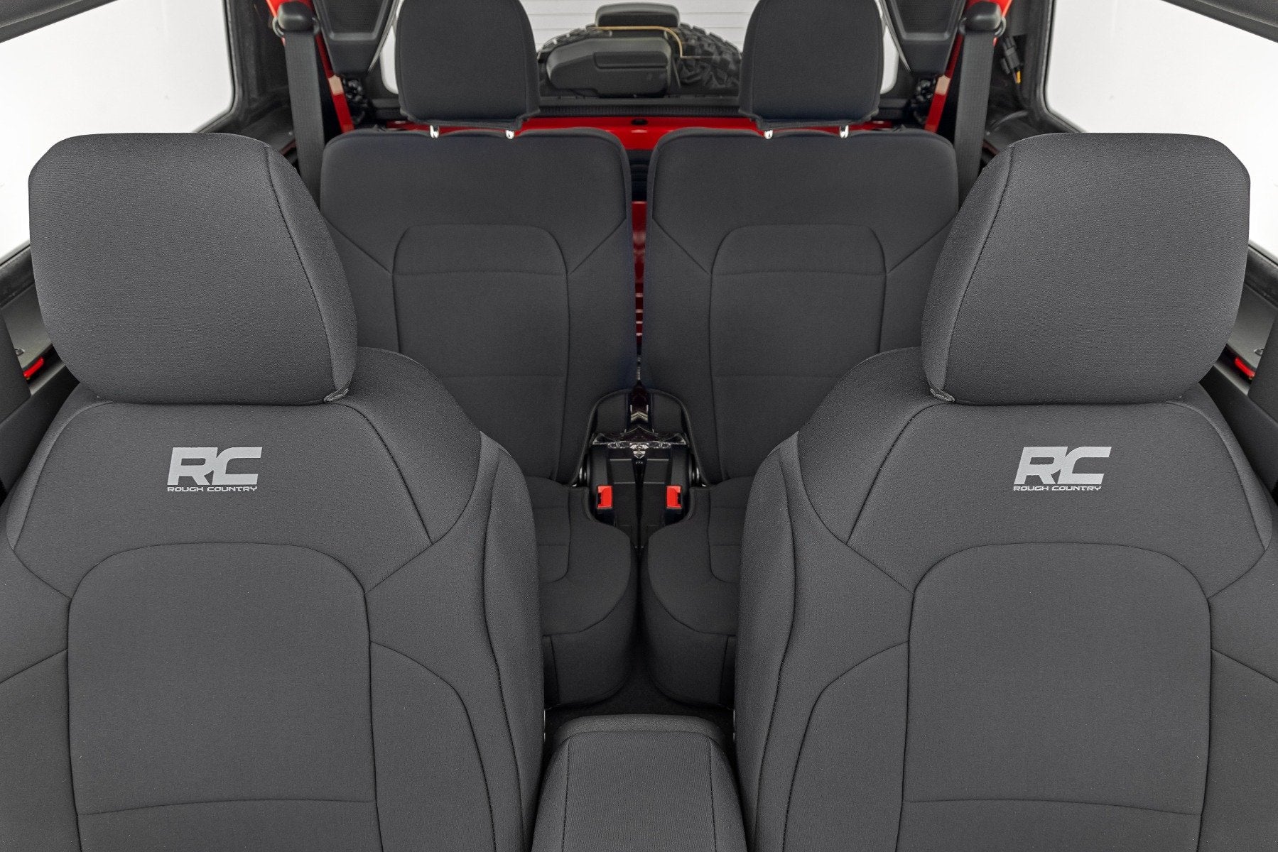 Want to protect your seats or are your seats showing signs of wear and tear from daily use? Say goodbye to unsightly stains and deterioration with Rough Country's Neoprene Seat Covers - the ultimate solution for preserving your vehicle's interior. Snug Fit for Optimal Protection: Our seat covers are tailored to fit your seats perfectly, providing a protective barrier against spills, scratches, and everyday wear and tear. Factory-Spec Construction: Engineered to meet factory specifications, our covers blend seamlessly with your vehicle's interior, giving it a fresh, new look without compromising on quality or style. Four-Layer Defense: With a four-layer construction featuring foam padding and a durable polyester shell, our seat covers offer unmatched protection and longevity, ensuring your seats stay looking new for years to come. Breathable and Water-Resistant: The neoprene layer not only provides breathability for added comfort but also boasts water-resistant properties, safeguarding your seats from spills and stains. Complete Coverage: Our covers come with full protection for your front seats, including headrest covers where applicable, as well as rear covers to shield your back seats from children and pet-related mishaps. Peace of Mind Warranty: Rest easy knowing your purchase is backed by our two-year warranty, giving you confidence in the durability and reliability of our product. Don't let worn-out seats diminish your driving experience. Upgrade to Neoprene Seat Covers today and enjoy a fresh, stylish interior that's protected against the rigors of daily life on the road.