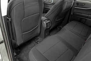 Want to protect your seats or are your seats showing signs of wear and tear from daily use? Say goodbye to unsightly stains and deterioration with Rough Country's Neoprene Seat Covers - the ultimate solution for preserving your vehicle's interior. Snug Fit for Optimal Protection: Our seat covers are tailored to fit your seats perfectly, providing a protective barrier against spills, scratches, and everyday wear and tear. Factory-Spec Construction: Engineered to meet factory specifications, our covers blend seamlessly with your vehicle's interior, giving it a fresh, new look without compromising on quality or style. Four-Layer Defense: With a four-layer construction featuring foam padding and a durable polyester shell, our seat covers offer unmatched protection and longevity, ensuring your seats stay looking new for years to come. Breathable and Water-Resistant: The neoprene layer not only provides breathability for added comfort but also boasts water-resistant properties, safeguarding your seats from spills and stains. Complete Coverage: Our covers come with full protection for your front seats, including headrest covers where applicable, as well as rear covers to shield your back seats from children and pet-related mishaps. Peace of Mind Warranty: Rest easy knowing your purchase is backed by our two-year warranty, giving you confidence in the durability and reliability of our product. Don't let worn-out seats diminish your driving experience. Upgrade to Neoprene Seat Covers today and enjoy a fresh, stylish interior that's protected against the rigors of daily life on the road.