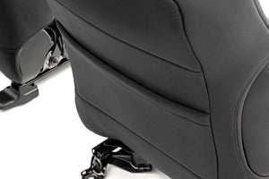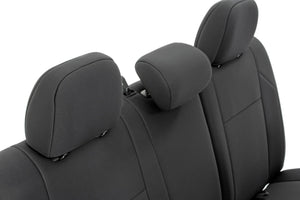 Want to protect your seats or are your seats showing signs of wear and tear from daily use? Say goodbye to unsightly stains and deterioration with Rough Country's Neoprene Seat Covers - the ultimate solution for preserving your vehicle's interior. Snug Fit for Optimal Protection: Our seat covers are tailored to fit your seats perfectly, providing a protective barrier against spills, scratches, and everyday wear and tear. Factory-Spec Construction: Engineered to meet factory specifications, our covers blend seamlessly with your vehicle's interior, giving it a fresh, new look without compromising on quality or style. Four-Layer Defense: With a four-layer construction featuring foam padding and a durable polyester shell, our seat covers offer unmatched protection and longevity, ensuring your seats stay looking new for years to come. Breathable and Water-Resistant: The neoprene layer not only provides breathability for added comfort but also boasts water-resistant properties, safeguarding your seats from spills and stains. Complete Coverage: Our covers come with full protection for your front seats, including headrest covers where applicable, as well as rear covers to shield your back seats from children and pet-related mishaps. Peace of Mind Warranty: Rest easy knowing your purchase is backed by our two-year warranty, giving you confidence in the durability and reliability of our product. Don't let worn-out seats diminish your driving experience. Upgrade to Neoprene Seat Covers today and enjoy a fresh, stylish interior that's protected against the rigors of daily life on the road.