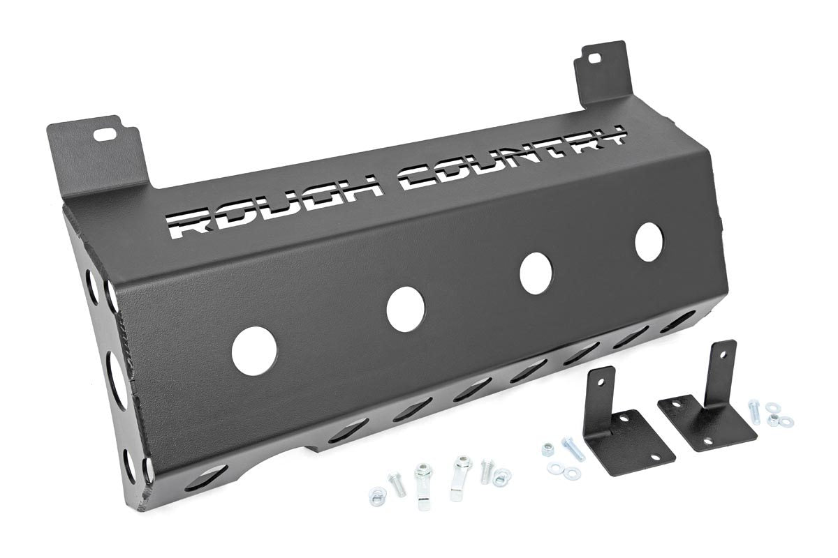 Protect your JLΓÇÖs Muffler from off-road hazards with Rough CountryΓÇÖs Muffler Skid Plate. This durable, 3/16 plate steel skid helps to protect your muffler from rocks, debris and anything else you can throw at it! The Jeep JLΓÇÖs exposed muffler is a vulnerable weak-spot when rock crawling or traversing uneven terrain. Fortify this area with a layer of plate steel protection and gain incredible peace of mind on your next trip out on the trails!This easy upgrade looks great, too, featuring a laser-cut ΓÇ£Rough CountryΓÇ¥ logo with an angled design and port holes for proper airflow and heat dissipation. With a 100% bolt-on installation procedure, this upgrade is easy to install as well, and features Rough CountryΓÇÖs Limited Lifetime Warranty.