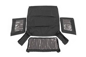 Upgrade Your Style. You love your Jeep Wrangler. And for good reason. It's a vehicle that embodies freedom, adventure, and the off-road lifestyle. But sometimes, you want to create something different, something more exciting. With our weather-resistant soft top replacement, we're making it easier than ever to customize your ride. Now you can upgrade your style while maintaining the rugged durability you depend on. Rough Country‘s Soft Top Cover is custom-designed to replace your JK factory top with ease. It's built to withstand even the harshest elements while providing lasting durability and unique styling.\Quality Construction. If you want your Jeep to last, you need to protect it! Our top covers feature a premium fabric that withstands the most extreme conditions. You can rely on our premium fit and construction to keep your Jeep looking sharp and ready to go. Our UV and mildew resistant vinyl coated polyester cotton material make this cover heat and water-resistant, with reinforced stitching with marine-grade bonded polyester thread, double stitched with heat-tape sealed seams for watertight protection. When you're ready for the breeze, our DOT-approved zip-on windows can be removed easily. If you want to experience the utmost in adventure, you need a top that can stand up to even the toughest conditions.\Installation. What makes our top different? Built to factory original quality specifications, it's designed to provide a tight, wrinkle-free fit on your JK Wrangler. Easy installation and durable all-weather fabric make this top a smart choice for the active enthusiast. With our state-of-the-art Belt Rail and Hook & Loop attachments, we've taken the guesswork out of installing Jeep tops so you can get a smooth, stable snap-on fit every time.\Limited Lifetime Replacement Warranty. Rough Country's products are backed with a limited lifetime replacement warranty towards manufacturer defects. As such, the product is protected from structural and workmanship damage after the date of purchase. With our industry-leading warranty give yourself peace of mind when using Rough Country's products!