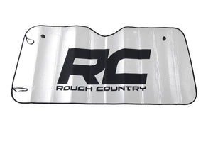 Beat the Heat! Whether you are driving your truck home or headed to another off-road adventure, no one likes to sit down and drive a hot vehicle that's been sitting in the sun for hours. Rough Country's Windshield Sunshade is a must-have if you spend a long day parked in the hot sun. Designed to fit the windshields of most trucks and Jeeps, this universal shade protects your ride against the hot summer sun.\Durable Protection. The flexible material contours to your window to help reflect UV rays that cause fading and cracking to the dash, steering wheel, and seats. Our sunshades are made with reflective aluminum foil combined with a bubble material that significantly lowers your vehicle's temperature. And with the lightweight design, it folds easily for storage. So beat the heat this summer with our Windshield Sun Shades. Your vehicle will thank you!