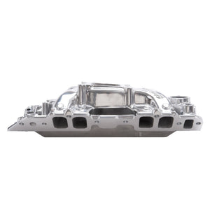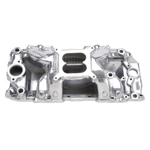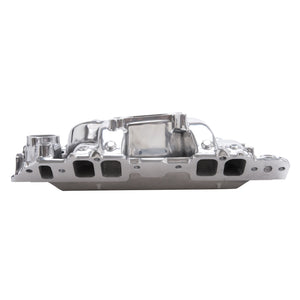 Edelbrock part #75621 RPM Air-Gap 2-R intake manifold is designed for street 396-502 c.i.d. Chevrolet V8's with high-performance rectangular-port heads. The open air space separates the runners from the hot engine oil, and as a result, the air/fuel mixture stays cooler for a denser charge and more power. This intake manifold is a dual-plane, high-rise design with a 180 degree firing order to produce incredible top-end horsepower while retaining good throttle response. The larger plenum and runners match the free-flowing exhaust, high-lift cams and other modifications of a high output engine. They are intended for high-performance's street or competition engines that run up to 6500 rpm. Includes rear water outlets, two distributor clamp locations and nitrous bosses. Accepts all late model alternator and A/C brackets for the street. For square-bore carbs only. No provision for exhaust heated chokes and no exhaust crossover. This manifold offers a polished finish for a brilliant shine and classic look.