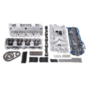 Edelbrock part #2038 E-Street EFI Top End Kit is designed for 1957-86 Small-Block Chevy V-8 engines. This Top End Kit produced 338 HP & 389 TQ on a 350 c.i.d. Small-Block Chevy with 9.0:1 compression. The kit delivers entry-level affordable street performance and great drivability from idle to 5,500 rpm. This kit includes a Performer EPS intake manifold, E-Street cylinder heads, Performer hydraulic flat tappet camshaft, pushrods, timing chain, complete bolt kit and an Edelbrock gasket set. To get great performance out of any engine, all of the components must work together. For over 30 years, the Edelbrock Total Power Package system has solved the parts matching puzzle for many street performance enthusiasts. With the introduction our Power Package Top End Kits, now you can get the best Edelbrock performance in-one-box, under one part number with "no guesswork" involved.