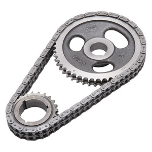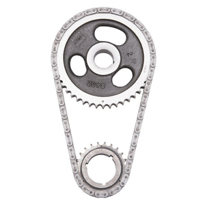 Edelbrock part #7803 Performer-Link timing chain is for use with Edelbrock or stock cams. They have a solid-bushing chain for a true bearing surface that rolls with the sprockets, eliminating chain stretch. Cam sprockets are made from 35,000 psi tensile strength cast iron. Crank sprockets are made from billet SAE-1144 steel and induction heat treated. Four Performer-Link sets are stock replacement parts and 50-state legal (see listings in bold type). All other sets have three keyway setting points to ensure accurate timing selection for early or late-model vehicles. Performer-Link timing sets are not for use above 6500 rpm- ? Performer roller chain sets are engineered to operate up to 6500 rpm.- ? Never hammer directly on chain or sprockets. You can crack the hardened links and pins and cause early failures. - ? Use a sleeve for installations that require hammering, a brass drift punch may be used if you carefully alternate blows on either side of the sprocket to avoid cocking. - ? Never stretch the chain with a screwdriver. - ? Check for clearance between the timing chain and block and between the chain and front cover before reassembly. - ? Be sure that both cam and crank sprockets are exactly in line with each other. Misalignment can cause chain to break