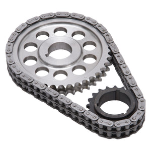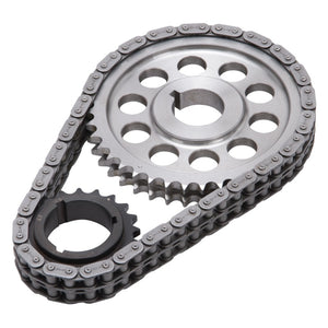 Edelbrock part #7828 Performer-Link timing chain is for use with Edelbrock or stock cams. They have a solid-bushing chain for a true bearing surface that rolls with the sprockets, eliminating chain stretch. Cam sprockets are made from 35,000 psi tensile strength cast iron. Crank sprockets are made from billet SAE-1144 steel and induction heat treated. Four Performer-Link sets are stock replacement parts and 50-state legal (see listings in bold type). All other sets have three keyway setting points to ensure accurate timing selection for early or late-model vehicles. Performer-Link timing sets are not for use above 6500 rpm- ? Performer roller chain sets are engineered to operate up to 6500 rpm.- ? Never hammer directly on chain or sprockets. You can crack the hardened links and pins and cause early failures. - ? Use a sleeve for installations that require hammering, a brass drift punch may be used if you carefully alternate blows on either side of the sprocket to avoid cocking. - ? Never stretch the chain with a screwdriver. - ? Check for clearance between the timing chain and block and between the chain and front cover before reassembly. - ? Be sure that both cam and crank sprockets are exactly in line with each other. Misalignment can cause chain to break