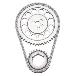 Edelbrock part #7805 Performer-Link timing chain is for use with Edelbrock or stock cams. They have a solid-bushing chain for a true bearing surface that rolls with the sprockets, eliminating chain stretch. Cam sprockets are made from 35,000 psi tensile strength cast iron. Crank sprockets are made from billet SAE-1144 steel and induction heat treated. Four Performer-Link sets are stock replacement parts and 50-state legal (see listings in bold type). All other sets have three keyway setting points to ensure accurate timing selection for early or late-model vehicles. Performer-Link timing sets are not for use above 6500 rpm- ? Performer roller chain sets are engineered to operate up to 6500 rpm.- ? Never hammer directly on chain or sprockets. You can crack the hardened links and pins and cause early failures. - ? Use a sleeve for installations that require hammering, a brass drift punch may be used if you carefully alternate blows on either side of the sprocket to avoid cocking. - ? Never stretch the chain with a screwdriver. - ? Check for clearance between the timing chain and block and between the chain and front cover before reassembly. - ? Be sure that both cam and crank sprockets are exactly in line with each other. Misalignment can cause chain to break