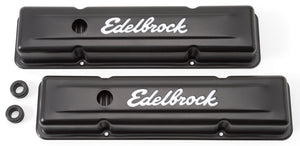 The Edelbrock #4443 Signature Series Valve Covers are designed for Chevrolet 262-400 '59-86 applications. Engineered for function and styled for great looks, Signature Series valve covers have stock-style breather baffles that prevent oil passage to the PCV valve. These quality valve covers accept all emissions equipment, including PCV valve holes. Rubber grommets for the breather and PCV valve holes are included. Matching breathers sold separately.