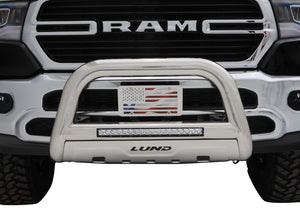 Protects your front end from flying debris with 3.5 inches of oval steel tubing. These bull bars also boost your visibility with an integrated 20 in. LED light bar. The included heavy duty light bar illuminates your night driving with a bright flood beam pattern and is easily wired into your factory light wiring, or a wiring harness can be purchased separately. Available in black textured powder coat or polished T304 stainless steel finish. Our popular LUND bull bars may now be ordered with a wire harness kit. The wire harness kit is also sold separately for lighting and accessories up to 30 Amps. LUND's bull bars with LED light bar and wiring kit is the total package to see and be seen, providing complete front end style, lighting and protection. Warranty Installation Instructions