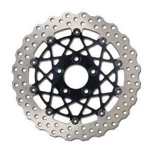 Performance Machine Speedstar Race Weight Full-Floating Brake Rotors are CNC precision machined to ensure a flat and parallel surface. Hardening the 420 stainless steel outer band to meet RC36 specifications, coupled with a full-floating design yields a rotor with a higher resistance to deformation. The wave cut braking surface is drilled in a sweep pattern for optimal heat dissipation with a reduction in weight. The inner carrier utilizes the increased strength of 7075-T6 aluminum for a lighter weight design while improving braking performance. The laser engraved PM logo on the floating elements will let everyone know you are serious about performance. Designed for use with most OEM and aftermarket wheels and calipers.