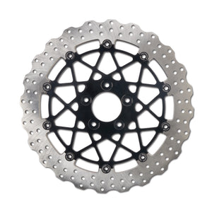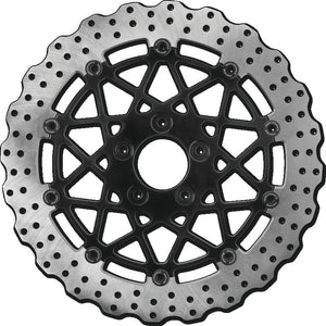 Performance Machine Speedstar Race Weight Full-Floating Brake Rotors are CNC precision machined to ensure a flat and parallel surface. Hardening the 420 stainless steel outer band to meet RC36 specifications, coupled with a full-floating design yields a rotor with a higher resistance to deformation. The wave cut braking surface is drilled in a sweep pattern for optimal heat dissipation with a reduction in weight. The inner carrier utilizes the increased strength of 7075-T6 aluminum for a lighter weight design while improving braking performance. The laser engraved PM logo on the floating elements will let everyone know you are serious about performance. Designed for use with most OEM and aftermarket wheels and calipers.