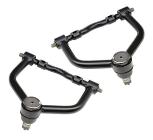 Front upper StrongArms for 1974-1978 Mustang II. Includes a pair of tubular control arms with cross shafts, rubber bushings and ball joints. Powder coated satin black.