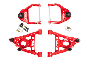 Improve performance and make your classic A-Body feel like a modern day muscle car with a complete set of fabricated tubular a-arms from UMI Performance. UMI's P/N 403133-1 upper and lower a-arm kit replaces the worn out, stock stamped a-arms with high-strength tubular construction and a host of premium features. The stock geometry lower a-arms feature tough tubular construction with polyurethane spring isolators for ride comfort and greaseable polyurethane bushings for precise handling and smooth suspension motion. The ball joint mount is angled slightly from stock to permit usage with lowered vehicles and the design offers additional tire clearance. The tubular upper a-arms are assembled with smooth operating, low deflection UMI designed and manufactured Delrin bushings as well as UMI-built billet CrMo cross shafts. They feature a relocated mounting pad to increase caster without excessive shims and are loaded with ½" taller upper ball joints to improve camber performance. Both upper and lower a-arms are jig built to maintain accuracy for a perfect fit every time and come preloaded with premium ball joints. Critical areas are TIG welded for superior strength and a clean look. UMI's extensive testing on the street, drag strip and skid pad ensures a quality product able to with stand all types of conditions. The ultra tough red or black powder coat finish guarantees your performance parts stay beautiful on your street car, drag car, autocrosser or Pro-Touring machine. The P/N 403133-1 a-arm kit will work with factory springs, lowering springs and coil over kits such as the popular QA1 coil over set up. For the best handling and tire life from the UMI designed a-arms, included with each kit are recommended alignment specs along with detailed installation instructions. UMI Performance a-arm kit P/N 403133-1 is shipped fully assembled and ready for installation.