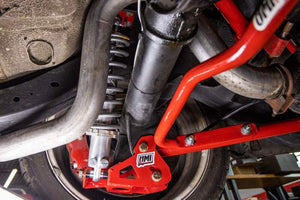 UMI’s bolt-in rear coilover kit allows full ride height, spring rate and damping adjustments, while trailing arm adjustment enables fine tuning of instant center. The reinforced upper mount is a direct bolt-in (requiring one additional hole to be drilled) and holds a true 2-1/2” racing coilover with double-shear mount. The FEA designed reinforced lower brackets bolt directly over the stock rear lower control arm mounts, utilizing the existing lower shock hole(s) (may requiring drilling of additional hole depending on factory configuration). The 2-hole trailing arm height adjustment enables fine tuning of instant center location for drag launch or auto-x/road race rear steer tuning. 100% designed, manufactured and raced out of Philipsburg, PA-USA and always US materials.