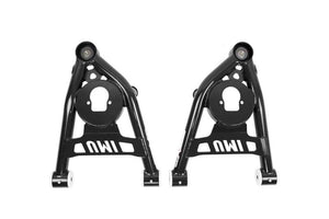 Tired of looking at hammered, crusty lower a-arms with cracked ball joint bosses? UMI has the solution with brand new modern tubular lower a-arms. UMI lower A-Arms are fabricated from DOM tubing with CNC machined tube ends for a precision fit. They are jig built to maintain accuracy and bolt on correctly every time. All critical areas are TIG welded for superior strength and a clean look. UMI's lower A-Arms also feature improved ball joint angle for lowered vehicles and the design provides additional tire clearance. Our P/N 4032 lower a-arms include greaseable, UMI designed and manufactured Delrin bushings. Delrin bushings offer supremely smooth suspension action and precision operation while still providing some insulation from road noise. They come preloaded with polyurethane bump stops, polyurethane spring isolators and premium ball joints. UMI's extensive testing on the street, drag strip and skid pad ensures a quality product able to with stand all types of abuse. UMI lower A-Arms are designed to work with factory springs, lowering springs and coil over kits without changing the a-arms. For exceptional handling and performance we recommend combining with UMI upper a-arms, part # 4033-1. UMI Performance lower a-arms are shipped fully assembled and ready for installation. Designed and manufactured with pride in Philipsburg, PA - USA.