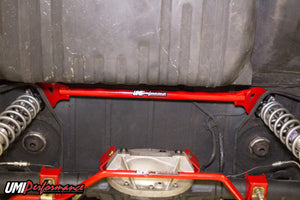 UMI’s bolt-in rear coilover kit allows full ride height, spring rate and damping adjustability for your 1978-1988 GM G-Body. The upper mount reinforcement is a direct bolt-in and holds a true 2-½” racing coilover with T-Bar. The FEA designed lower bracket bolts in using the standard trailing arm mounting hole as well as an additional reinforcement hole normally used by the standard rear shock. The lower bracket features a multi-position design to allow further fine tuning of ride height and shock location (±¾”). The included Viking shock is 19-way adjustable in both compression and rebound and ensures the perfect setting for every application. The 2-½” coilover springs are available in 14” 110lb for drag and street use and 12” 150lb for street and handling use. There is no cutting required and your car can be returned to stock if desired. UMI’s rear coil over kit also works if your car previously utilized UMI P/N 3010 weld-on relocation brackets. 100% designed, manufactured and raced out of Philipsburg, PA-USA and always US materials.