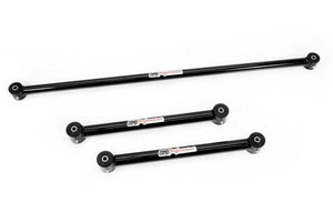 This complete kit replaces your weak, factory stamped lower control arms and panhard bar with our heavy duty tubular setup. These direct bolt-on replacements minimize wheel hop, improve cornering while lowering ET's and helping track consistency. The panhard bar greatly increases rear stability, controls side movement and body flex while the lower control arms help to reduce unwanted wheel hop. Both items are constructed of Seamless DOM mild steel tubing, stronger and less flex then Aluminum made versions on the market. Control arms and panhard bar are both completely CNC machined and fully TIG welded featuring Energy Suspension polyurethane bushings, zinc plated steel sleeves and "on car" grease-able grease fittings.