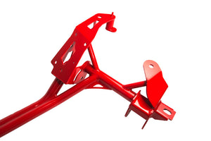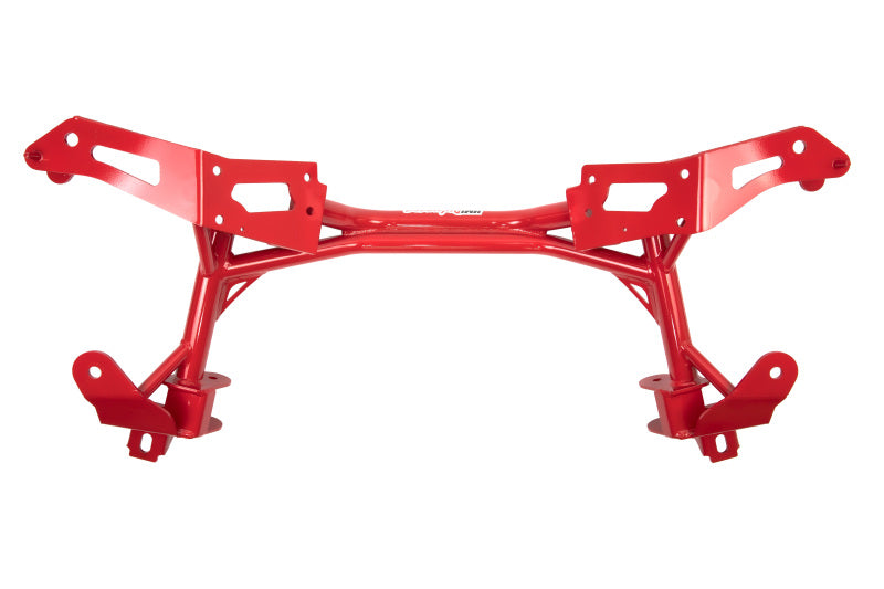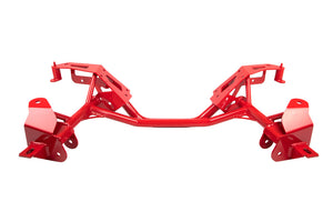 Less weight plus high strength equals road race and auto-x success. UMI’s direct bolt-in replacement Road Race K-member instantly removes 20 lbs of front end weight from your ride and helps your existing horsepower work for you while providing a capable, high strength foundation. UMI’s RR k-member features strong dual tube construction as well as extra tubing and gusseting in critical areas. The K-member is fabricated from CNC machined 3/16” thick mild steel held together by a strong dual tube lower section. Factory clamshell and engine mounts bolt to the precision machined mounting pads while both factory and aftermarket suspension is located by strong boxed mounting points. Lightening holes are CNC machined into the mounting plates and the tubular construction provides added clearance for aftermarket exhaust. The modular design permits stock spring and strut use or simply remove the spring pockets and convert to coil-overs. Street and track testing on our test car has shown this K-member to be strong, reliable and a great upgrade for your high performance ride. Available in tough powder coated red or black finish. Manufactured with pride in Philipsburg, PA - USA