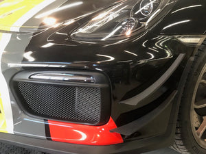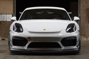The Dive Planes for the Porsche 981 GT4 were specifically designed to increase front-end downforce, increase the high-pressure airflow to the factory intake duct, and to keep drag increase minimal.