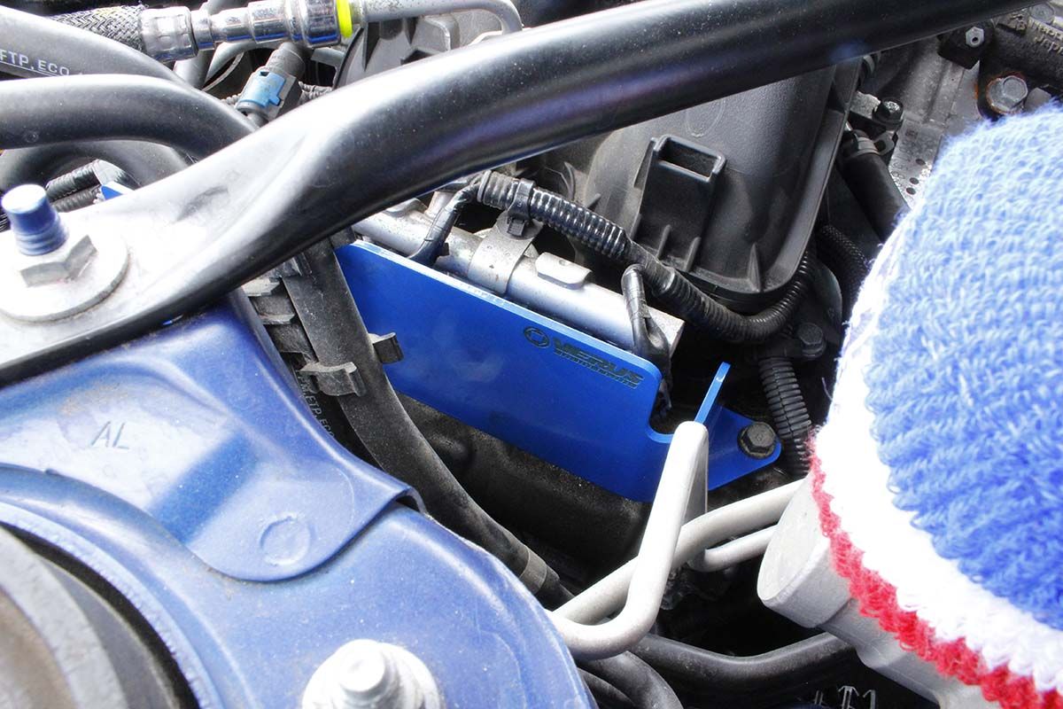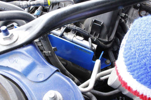Shed weight from the engine bay by removing the factory bulky steel piece and installing our lighter stainless steel brackets. These are powder coated in three popular colors to add some color to the engine bay as well.
