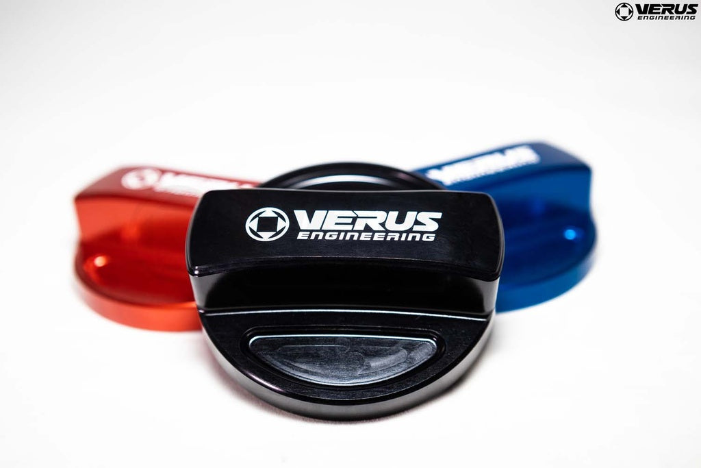 The caps are offered in three common colors to match your other Verus Engineering fluid caps. The units install easily and in under a minute with no tools required. The units feature a retention style mounting and do *not* require double-sided tape.