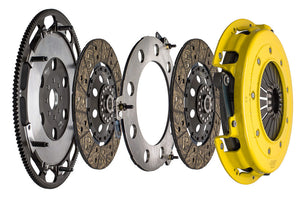 T1S-F05 street, twin disc kit offers twice the number of disc surfaces for better wear, heat capacity and long life compared to single disc kits. These kits use a proprietary Positive Lift Floater System design, which results in quiet operation with no floater rattle and no posts to wear. ACT twin disc kits endure an exclusive four-stage, heat-treating process on all diaphragms. The ACT twin disc kits features the ability to adjust for disc wear and provides equal disengagement for discs. The Performance street rigid-hub discs feature premium organic materials with high copper content for better heat transfer and steel-backed lining for greater burst strength and durability. The chrome-moly hub is heat-treated for strength and durability. Rivet design and materials are carefully selected for maximum strength. All ACT twin disc kits include a CNC-machined and dynamically balanced flywheel to ensure trouble-free installation and operation. ACT twin disc kits include a pressure plate, two discs, a floater, flywheel and alignment tool. Some kits may include a pilot bearing and release bearing.