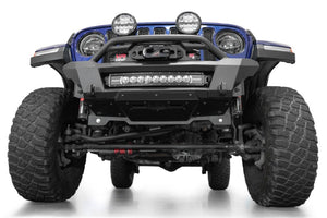 With its stubby width and high clearance fitment, our Phantom Series Winch Front Bumper is made for aggressive off-roading & rock crawling. The knife's edge design offers an aggressive look that compliments your Jeep's factory lines. Recovery options include a heavy-duty winch mount and two 1-inch thick clevis mounts that take ¾-inch D-rings. For supplemental lighting, a 20-inch LED light bar can be mounted at the center of the bumper and a pair of cube or round lights can be mounted above the bull bar. The narrow width allows for maximum tire and obstacle clearance when on rocky terrain. Included with the bumper is a 3/16-inch lightweight aluminum skid plate that protects the sway bar disconnect. The Phantom is made from American steel that is finished in a dual-stage hammer black powder coat, and features satin black aluminum accent panels. As always, this is fully bolt-on and Made in the USA.