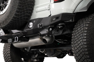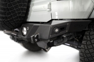 The Krawler Rear Bumper was designed for heavy trail use and features high clearance angles. Its low profile fitment and modern plate steel construction is well suited for rock crawling. Two 3-4-inch round light mounts provide options for supplemental rear lighting. The Krawler accommodates the OEM Tire Mount & back-up camera, as well as the factory hitch and trailer harness. Included with the bumper is a 3rd brake light extension bracket compatible with up to a 37-inch spare tire, and a license plate relocation bracket that mounts to the carrier. Recovery options include heavily reinforced clevis mounts for ¾-inch D-ring shackles. The bumper is finished in a hammer black powder coat, while its aluminum accent panels are finished in a satin black powder coat. As always, the Krawler is fully bolt-on and made in America.