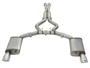 This cat-back exhaust system is constructed of 2-1/2 IN mandrel-bent 304 stainless steel tubing for maximum strength and durability. Finishing off this exhaust system are dual 4-1/2 IN diameter polished 304 stainless steel clamp-on exhaust tips. The tips features a laser etched aFe POWER logo for a unique style. This system features high-flow 409 stainless steel polished mufflers, producing an aggressive sound. Muffler finish may vary. This system produces a deep sound unleashing all available horsepower and torque. Designed to equalize and evenly distribute exhaust pulses reducing drone, improving sound. Utilizing factory style flanges and hangers this system is a direct bolt-on system, which requires no cutting or modifications for a hassle-free installation. A mitered merge x-pipe is used to balance and evenly distribute exhaust pulses traveling through the exhaust system, minimizing exhaust drone and maximizing scavenging. State-of-the-art computer-aided design technology is utilized for precise vehicle fitment. 100% MIG-Welded for race-proven strength and durability.