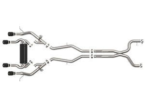 This cat-back exhaust system is constructed of 3 IN - 2-1/2 IN mandrel-bent 304 stainless steel tubing for maximum strength and durability. This system features a high-flow stainless steel muffler, producing a mild sound. Muffler finish may vary. Finishing off this exhaust system are quad 4 IN diameter black 304 stainless steel clamp-on exhaust tips. The tips features a laser etched aFe POWER logo for a unique style. This system produces an aggressive sound unleashing all available horsepower and torque. Some cutting may be required, see instruction sheet for further information. Utilizing factory style hangers this system mounts directly to factory mounting locations for a hassle-free installation. A mitered merge x-pipe is used to balance and evenly distribute exhaust pulses traveling through the exhaust system, minimizing exhaust drone and maximizing scavenging. This system incorporates factory style exhaust valves which use the factory exhaust valve motors (not included). The valves help regulate, direct and control the flow of exhaust gases by opening, closing, or partially obstructing passageways depending on throttle position for maximum performance. State-of-the-art computer-aided design technology is utilized for precise vehicle fitment. 100% TIG-Welded for race-proven strength and durability.