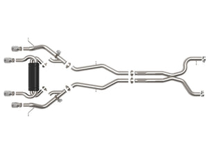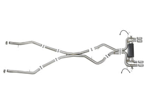 This cat-back exhaust system is constructed of 3 IN - 2-1/2 IN mandrel-bent 304 stainless steel tubing for maximum strength and durability. This system features a high-flow stainless steel muffler, producing a mild sound. Muffler finish may vary. Finishing off this exhaust system are quad 4 IN diameter polished 304 stainless steel clamp-on exhaust tips. The tips features a laser etched aFe POWER logo for a unique style. This system produces an aggressive sound unleashing all available horsepower and torque. Some cutting may be required, see instruction sheet for further information. Utilizing factory style hangers this system mounts directly to factory mounting locations for a hassle-free installation. A mitered merge x-pipe is used to balance and evenly distribute exhaust pulses traveling through the exhaust system, minimizing exhaust drone and maximizing scavenging. This system incorporates factory style exhaust valves which use the factory exhaust valve motors (not included). The valves help regulate, direct and control the flow of exhaust gases by opening, closing, or partially obstructing passageways depending on throttle position for maximum performance. State-of-the-art computer-aided design technology is utilized for precise vehicle fitment. 100% TIG-Welded for race-proven strength and durability.