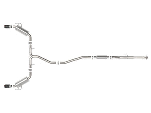 This cat-back exhaust system is constructed of 2-1/2 IN - 2-1/4 IN mandrel-bent 304 stainless steel tubing for maximum strength and durability. This system features high-flow 304 stainless steel polished mufflers, producing a aggressive sound. The mufflers has a polished finish for ultimate corrosion resistance. Finishing off this exhaust system are dual 3-1/2 IN diameter carbon fiber 304 stainless steel clamp-on exhaust tips. The tips features an aFe POWER logo for a unique style. This system produces an aggressive sound unleashing all available horsepower and torque. Utilizing a factory style flange and hangers this system is a direct bolt-on system, which requires no cutting or modifications for a hassle-free installation. A mitered merge collector is used to decrease turbulence and increase exhaust velocity resulting in increased horsepower, torque and improved throttle response. State-of-the-art computer-aided design technology is utilized for precise vehicle fitment. 100% MIG-Welded for race-proven strength and durability.