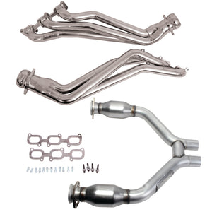 These BBK Performance full length exhaust headers and matching high flow catted mid pipe kits offer unsurpassed value, performance, quality, and fitment. Dyno tested and built right here in the USA our products outperform the competition hands down.Every long tube exhaust header system is built with CNC mandrel bent tubing for unrestrictive exhaust flow and maximum performance. All headers include 3/8" laser cut exhaust flanges, patented scavenging collector design and gasket less ball and socket connectors to easily connect the matching mid pipes.These performance exhaust kits have been designed specifically for your vehicles application to get the most horsepower and torque to the ground for maximum performance across the RPM range.All matching mid pipes included in our kits have high flow catalytic converters installed optimum sound and performance gains.All of these BBK kits are designed to replace the factory shorty style headers and factory mid pipe. Each BBK long tube header and matching mid pipe kit will bolt directly up to your cat back exhaust on your vehicle to complete the system to the tail pipe.Our decades of exhaust design and experience make BBK Performance the number one choice for your late model American car or truck.