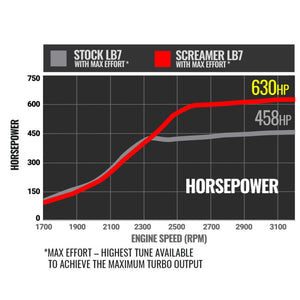 A drop-in, stock-appearing turbo for the Duramax LB7 which utilizes modern-day turbo technology. New compressor and turbine wheels have been designed to give you increased airflow without compromising on low end response. Every turbo has been balanced on a high speed VSR turbo balancer in order to safely increase your boost to 32psi. With supporting modifications, the LB7 Screamer is capable of up to 630hp and works with any "box" tuner. Installation Instructions Installation Instructions