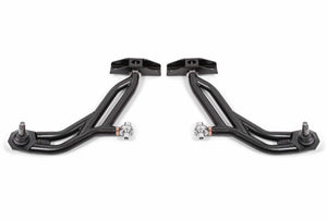 A-arms are one of the most important, yet overlooked suspension components. They are the direct link between the front wheels and the chassis. Any deflection causes a change in alignment, which results in poor performance and driving feel. Fabricated from heavy-duty 1.25-inch, 0.120-inch wall DOM tubing, deflection is eliminated with A-arms from BMR Suspension. BMRs AA757 Lower A-arms are equipped with greasable heavy-duty ball joints, greasable Delrin bushings (rear mount) to handle the high loads, and zinc-plated, X-series, heat-treated, chrome-moly, self-lubricating, Teflon-lined rod ends for loads of adjustability. Solid mounts give you a more responsive feel over the stock rubber bushings. BMRs bushings allow grease to evenly coat the inner sleeve. This efficient lubrication ensures quiet, reliable operation over the life of the bushings. The combination of rod ends and Delrin bushings gives you improved steering feel and responsiveness for any for of driving. Based on our well proven traditional A-arm design, these Handling A-arms feature -inch taller ball joints to raise the roll center height on lowered vehicles for improved handling.BMRs AA757 lower A-arms eliminate A-arm deflection, greatly improving steering feel and response in normal and performance driving situations. The rod ends and Delrin bushings add strength and reduce deflection over the stock rubber bushing. The means you get great performance. Designed for street performance, drag race, and handling, and pro-touring applications, BMR lower A-arms are engineered to give you improved geometry and increased lateral grip during cornering situations.BMR Suspension AA757 Adjustable Lower A-arms are available in black hammertone and red powdercoat for long-lasting good looks. Installation time is 3-4 hours. Proudly made in the U.S.A.Control arm hardware kit RH014 (Includes upper and lower control arm hardware - Highly Recommended) also available.